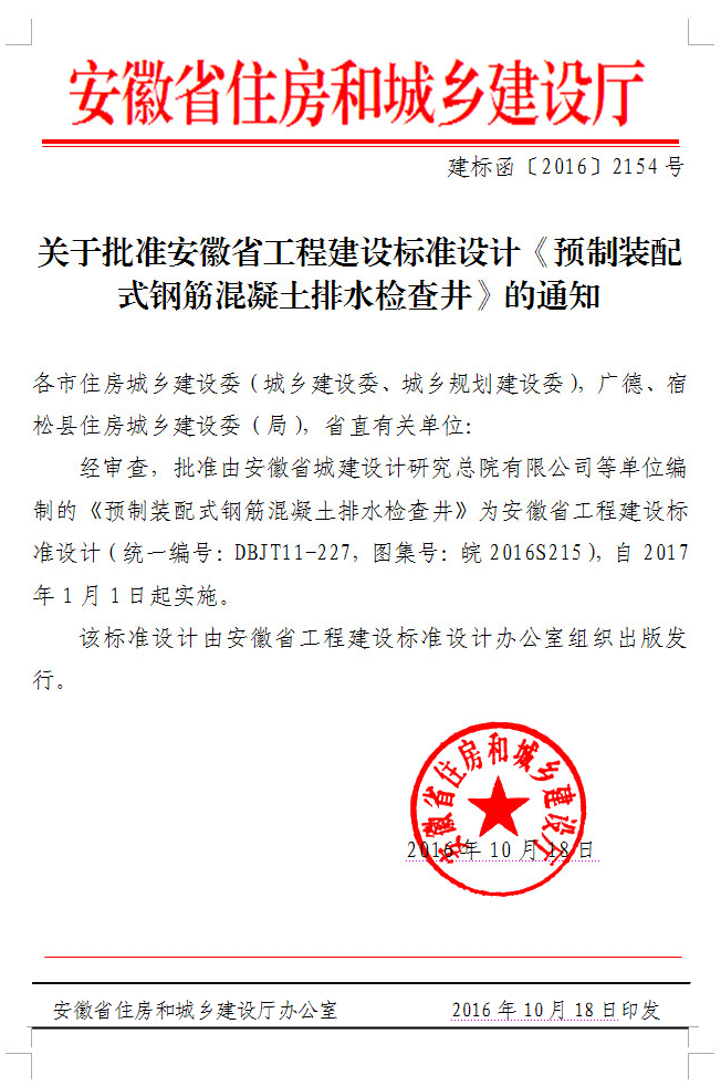 關于批準安徽省工程建設標準設計《預制裝配式鋼筋混凝土排水檢查井》的通知