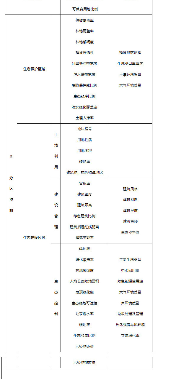 生態(tài)控制類的控制性指標包括綠地率、綠化覆蓋率、林地郁閉度、人均公園綠地、屋頂綠化率、生態(tài)綠地可達性、地表透水率、硬地率、生態(tài)駁岸比例、污染物排放量等;引導(dǎo)性指標包括主要生境類型、中水回用率、綠色能源使用率、大氣環(huán)境質(zhì)量、聲環(huán)境質(zhì)量、垃圾處理及管理、熱島強度與風(fēng)環(huán)境、立體綠化率等。